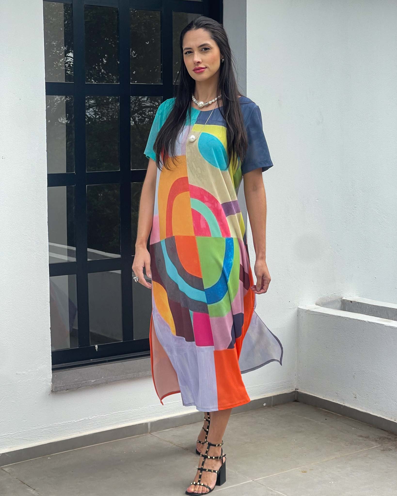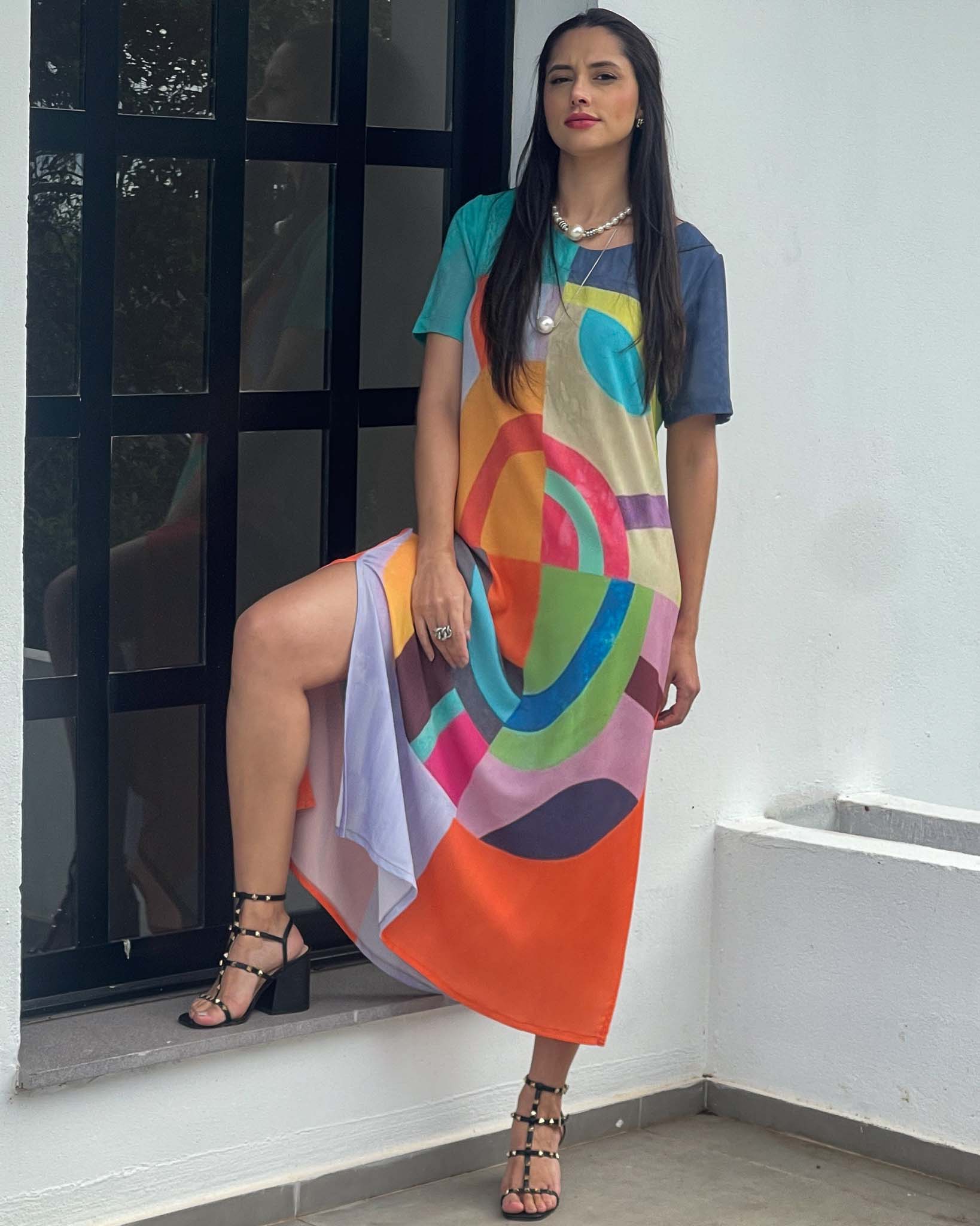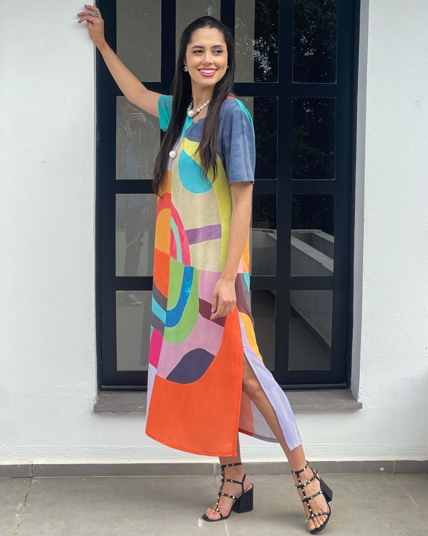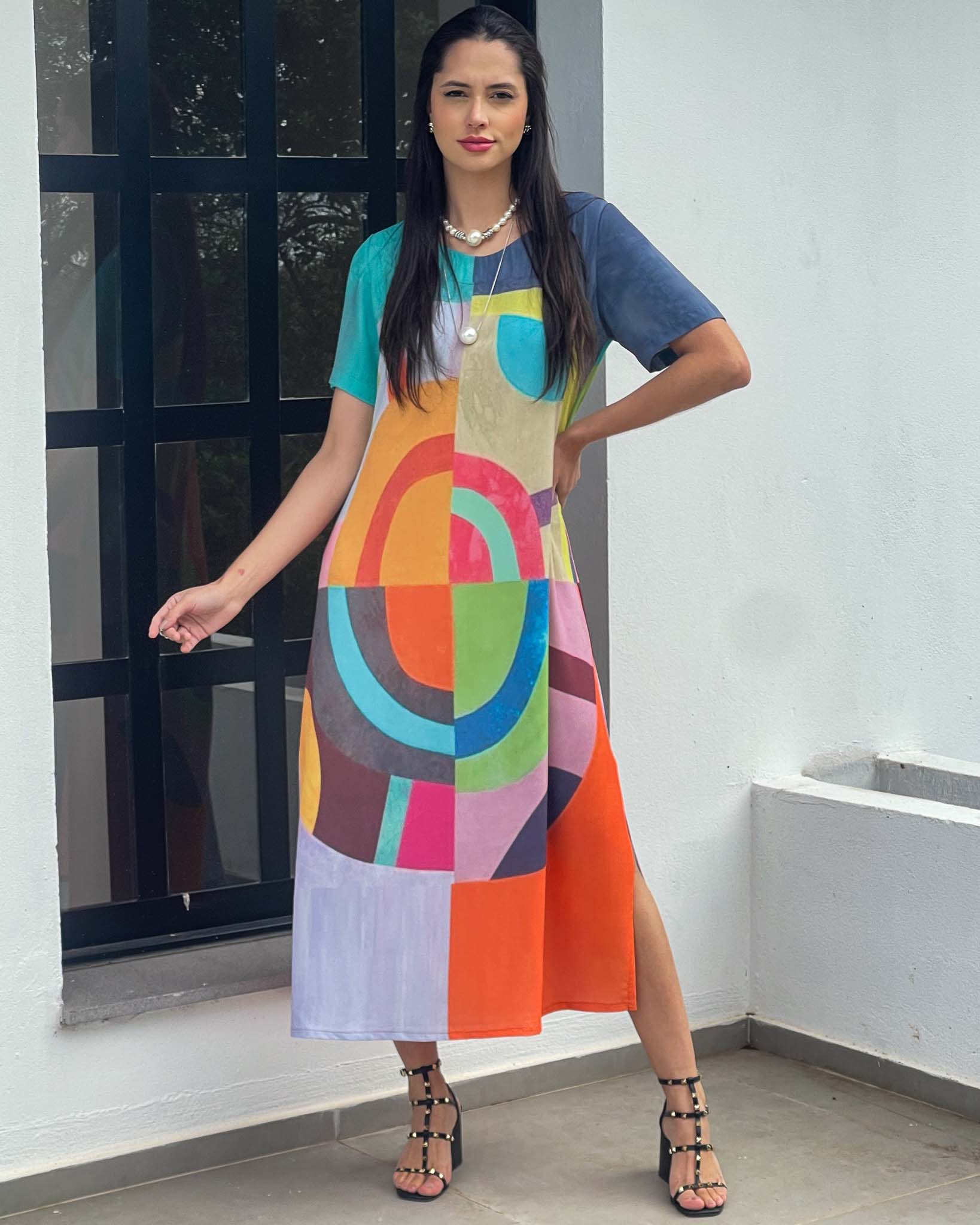 Vestido longuete em crepe bubble com modelagem reta e abertura lateral. Apresenta estampa exclusiva e design contemporâneo, unindo conforto e versatilidade em uma peça única e cheia de personalidade.